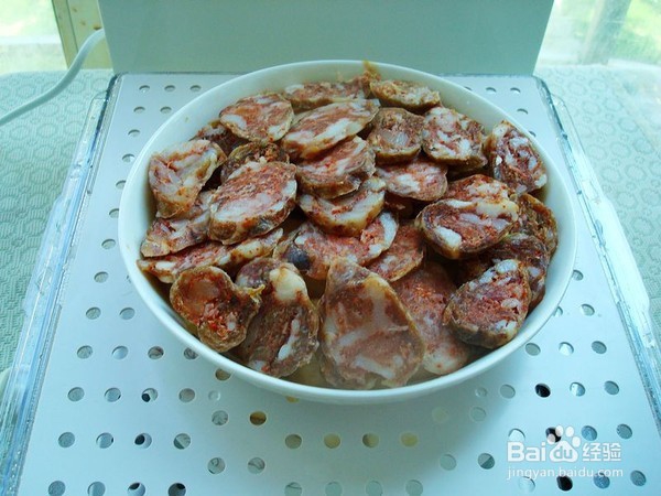 3、把腊肠洗洗切片 这是我自己做的腊肠,是麻辣味的,不必再次煮熟透