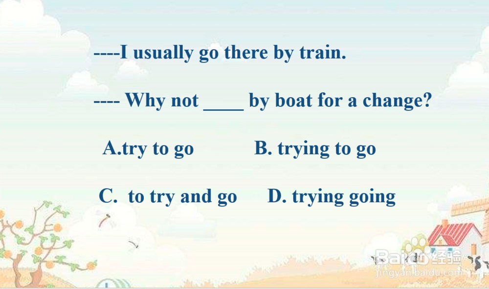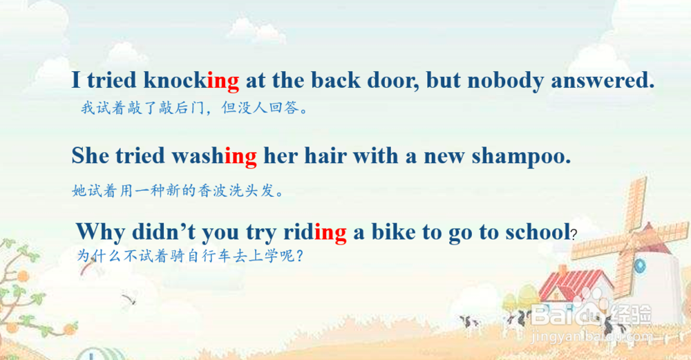 5、try 作为动词的第二个常见的词组是“try doing sth.”,表示“试一试做……”,“尝试去做”,看看结果如何。