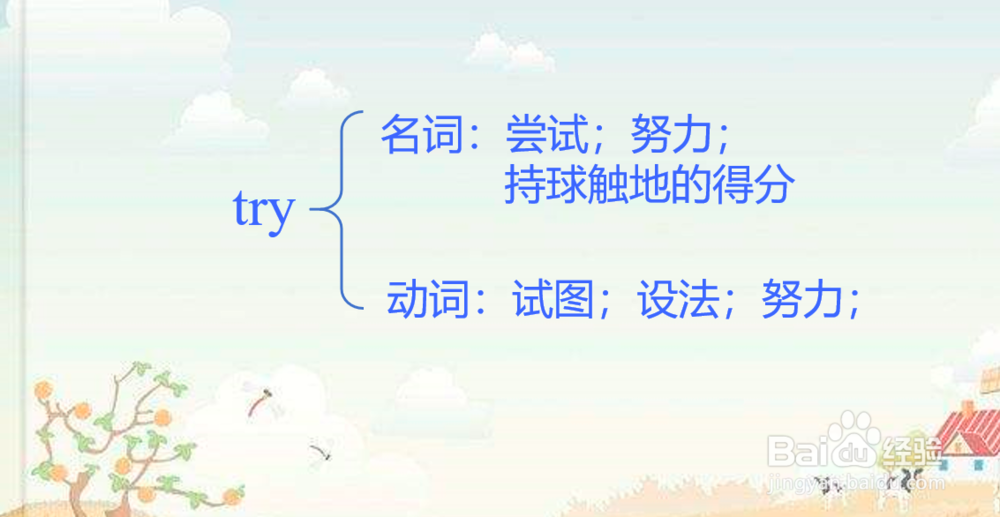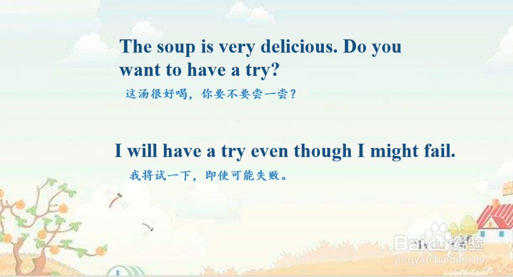 2、先来说作为名词的用法。作为名词时,常见的意思是“尝试,努力”。常见的词组 “have a try ”。在句子中感受一下吧。