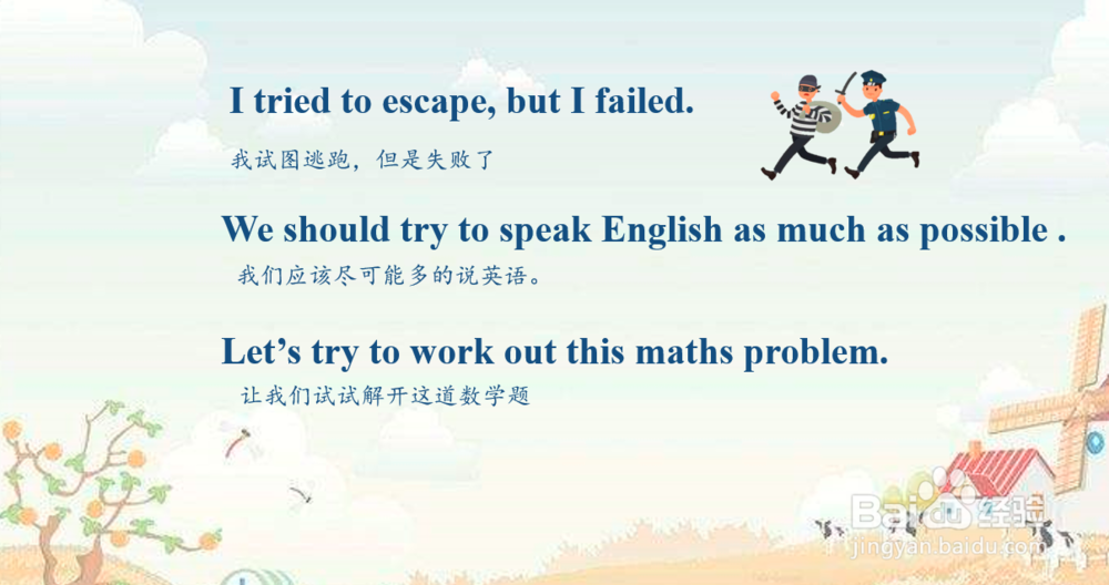 3、try 作为动词时,第一个常见的词组是“try to do sth.”,表示 “尽力去做……”,“试图做……”,“努力地去做……“,付出努力,竭尽所能,用很大的努力试图去做某事,想尽一切办法要把事情办成(但不一定成功),强调的是付出。