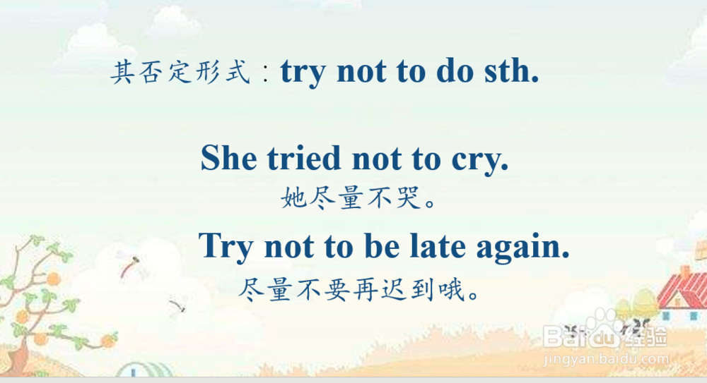 4、"try to do sth "的否定形式"try not to do sth."也是常考的一点,表示“尽量不要做……”。感受一下例句。