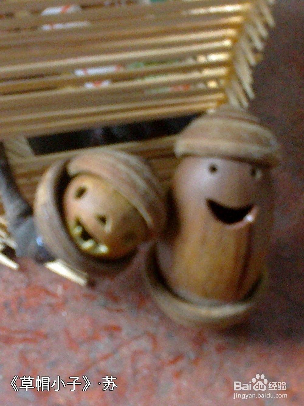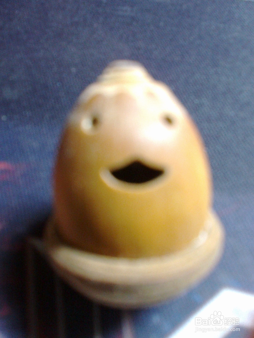 4、用锥子钻出眼睛,刻刀大致刻出嘴巴。然后把侵截倘眼镜、嘴巴进一步修刻得大小、轮廓协调、刻面秀得平滑
