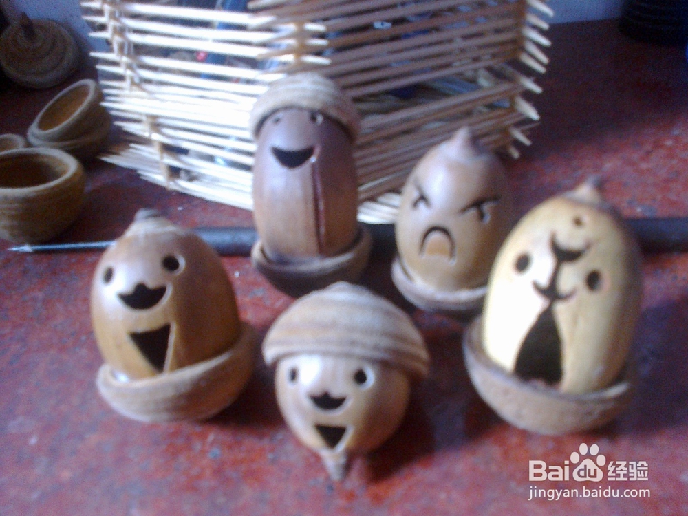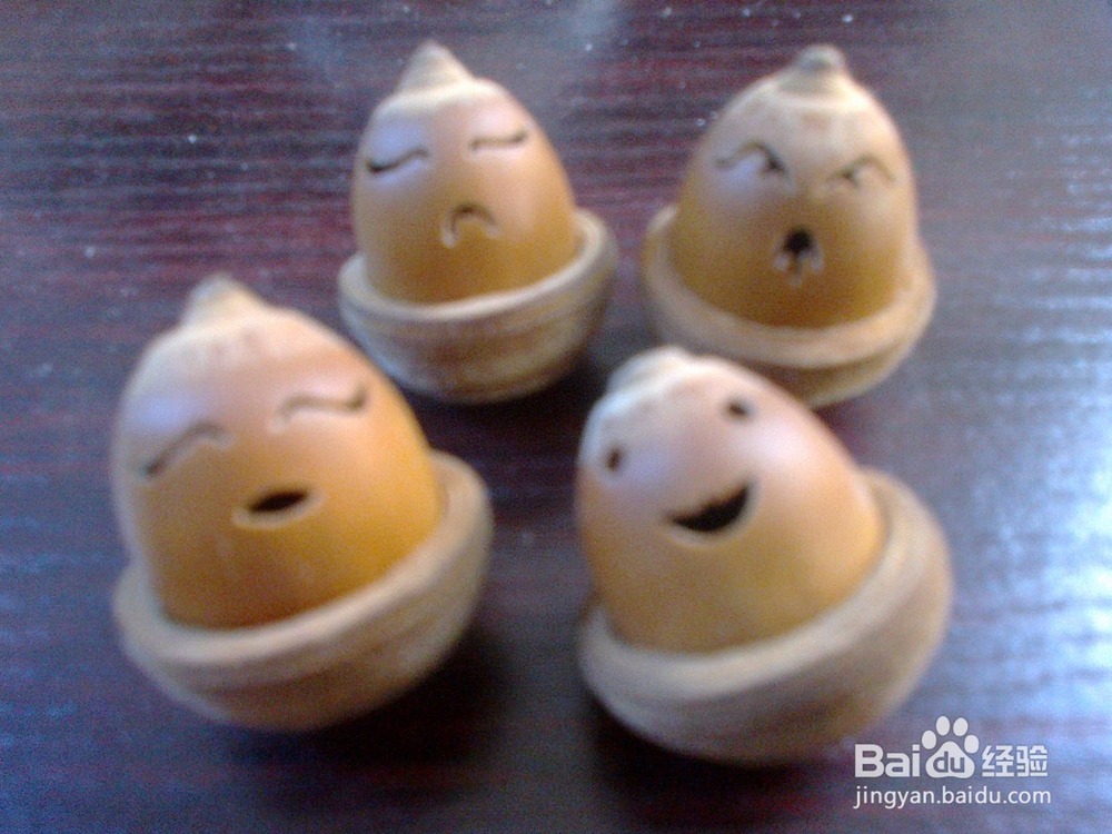3、想象芬宋要刻的表情,并用尖锥在果壳表面确定眼睛嘴巴位置,轻轻画出大致轮廓