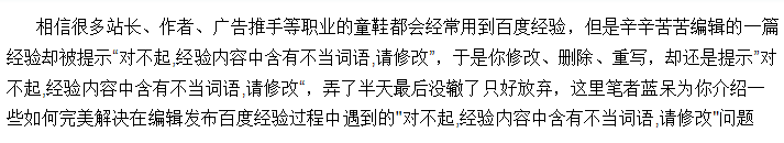 1、 方法很简单,就是将你无法判断哪段是不当词语下,一段段的截图,然后当成图片上传,其他段落仍然是文字,这样一段段试就可以知道哪段有不当词语了。然后将有不当词语那段作为图片放上去,这样就能完美解决”对不起,经验内容中含有不当词语,请修改“的问题了。以下这段就是笔者截的第一段的图片。