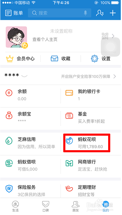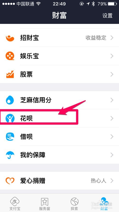 4、登陆支付宝账户页面,会发现蚂蚁花呗的选项,如果没有,就在顶上搜索