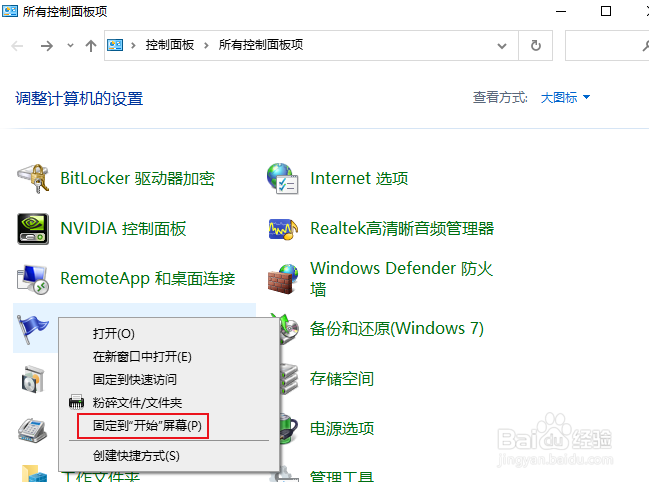 1、打开"控制面板",然后将"查看方式"选项设置为"大图标"。右键单击要固定在"开始"菜单上的任何特定项。