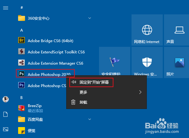2、从弹出式菜单中选取"固定到'开始'屏幕"。