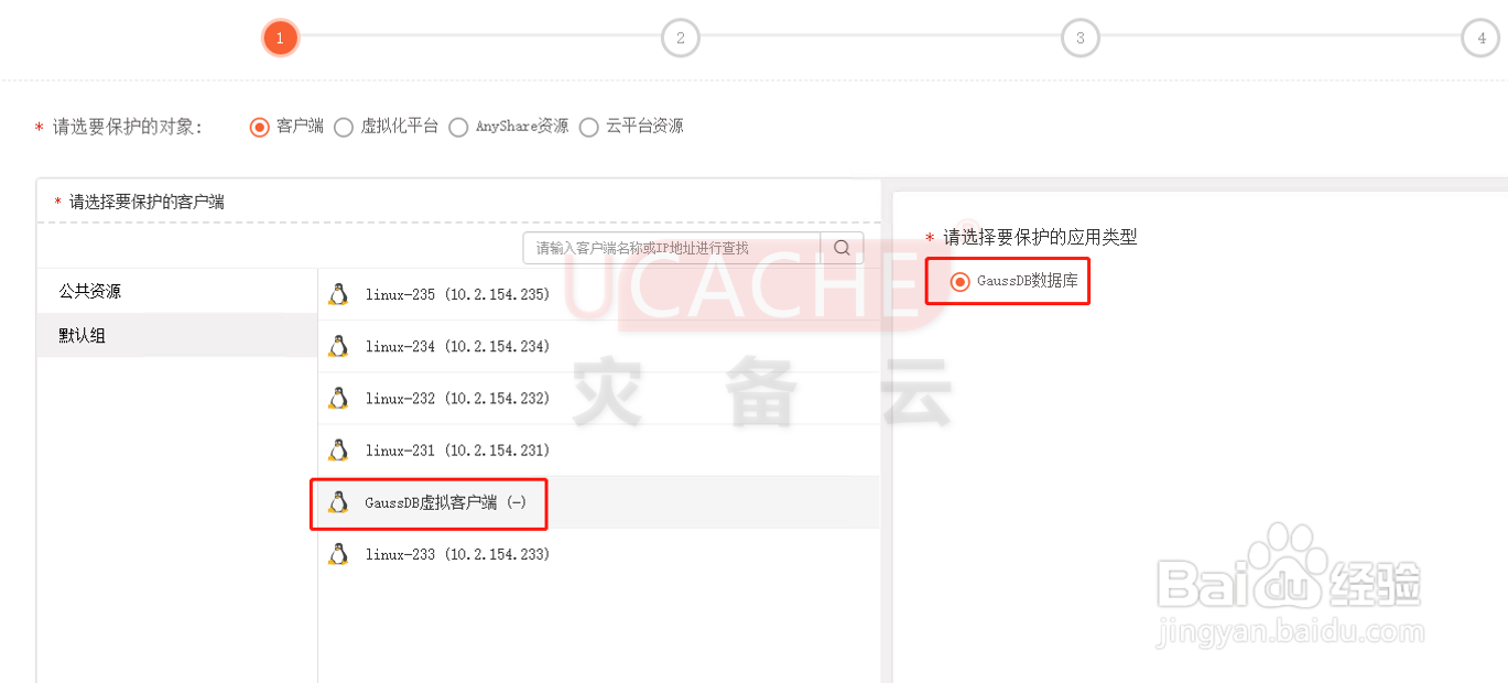 点击【新建】,选择要保护的对象,→默认选【客户端】 选择要备份的客户端,多个可以指定进行勾选,选择要保护的应用类型: →【GaussDB数据库】,点击【下一步】。