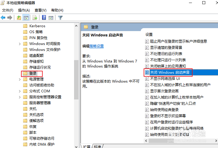 2、导航到:计算机配置\管理模板\系统\登录。右侧窗口双击“关闭Windows启动声音“。