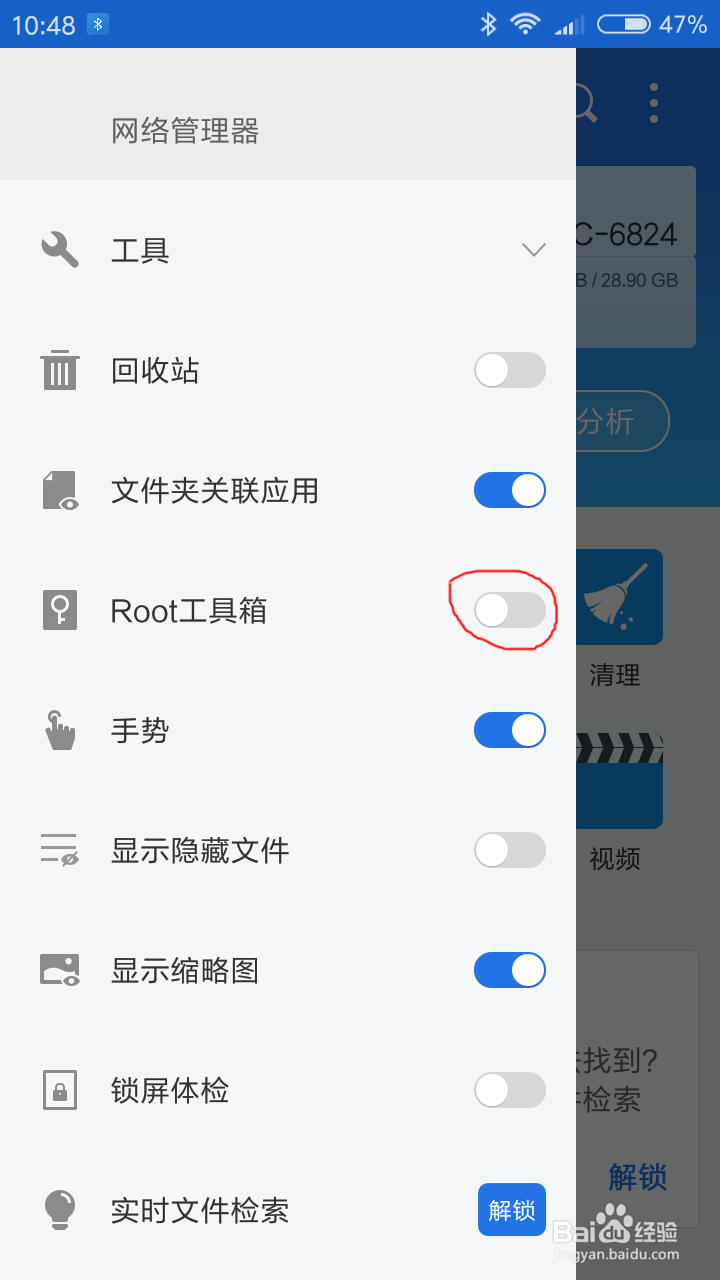 3、点击画圈部分变成蓝色就开启了"Root工具"