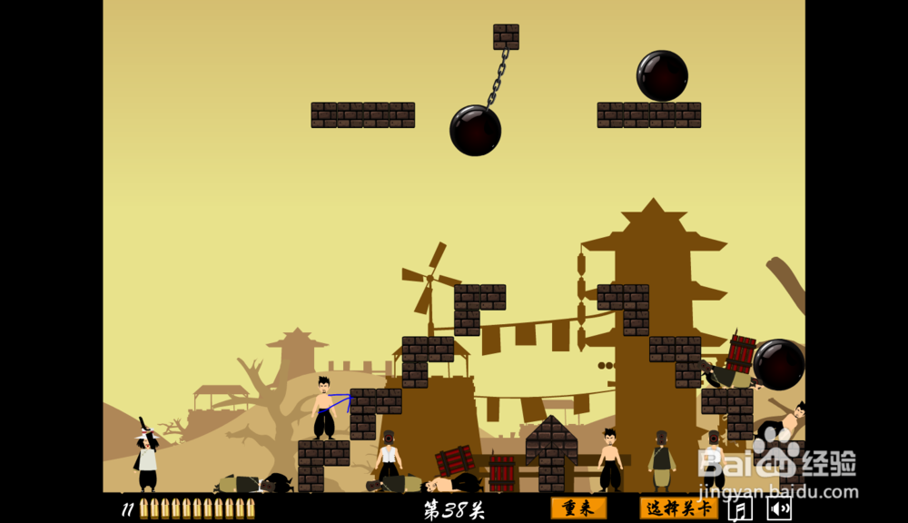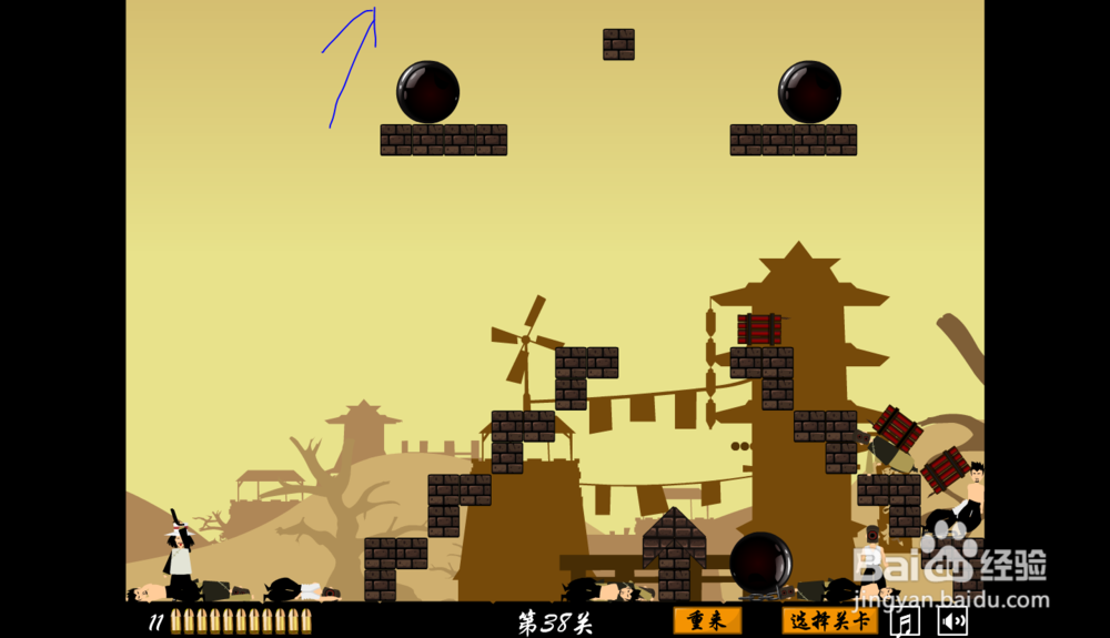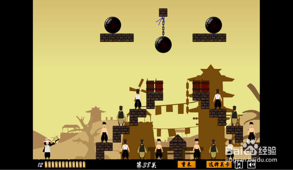 5、朝右上方靠近左边铁球位置射击,子弹反射,将铁球弹射到右边落下,正好落进下面墙体内,将最后一名土匪砸死。