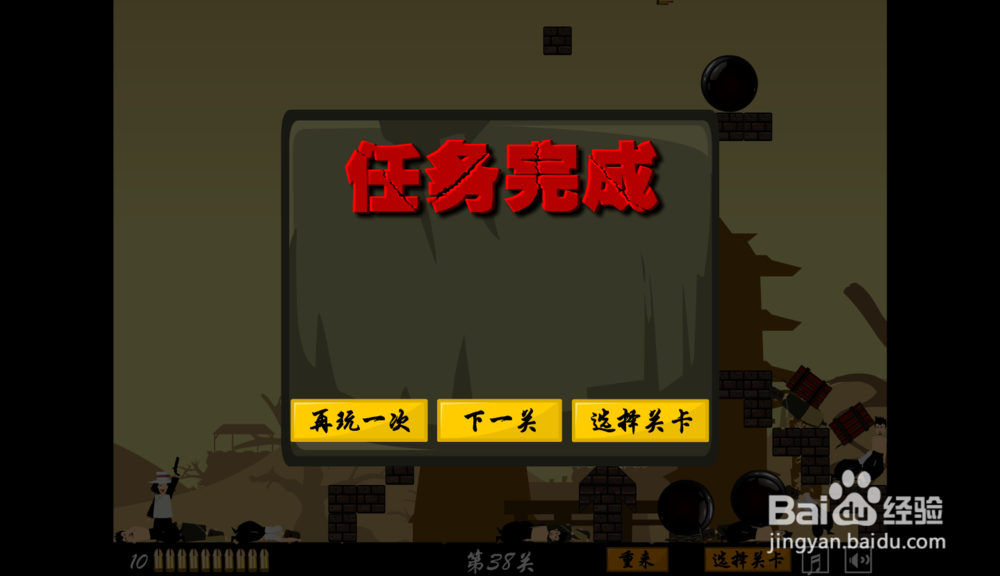 6、任务顺利完成。说明一点,每一种策略都有不确定因素,如果不能地挥炸药的威力,仅凭子弹射击、反射,有时很难清除个别隐蔽在角落处的土匪。