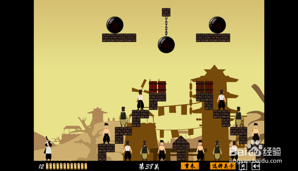 2、朝右上方靠近左边铁球位置射击,子弹反射,将铁球弹射到右边落下,子弹反射过程中又将下方炸药引爆,铁球砸击、炸药爆炸的威力将多名土匪消灭。