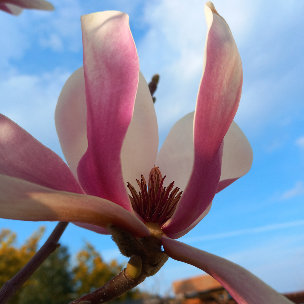 玉兰花 春风清爽晴空天, 玉兰枝头笑开颜.