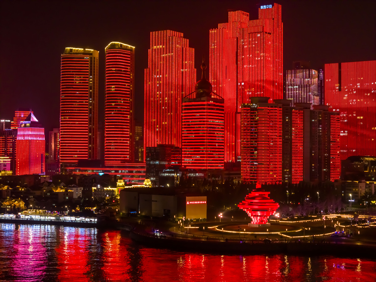 10月1日晚,长沙市湘江两岸地标建筑上演国庆主题灯光秀,滚动播出展示