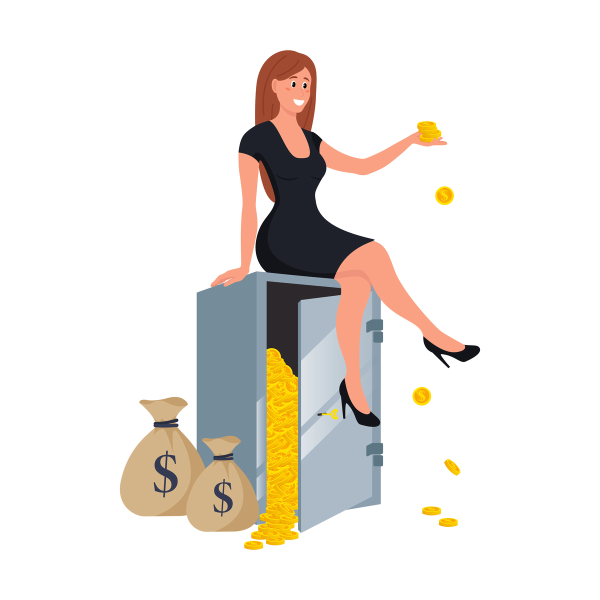 插图元素女子坐在金币堆前扁平ai插画金色美元符号金币在空中飞舞画面
