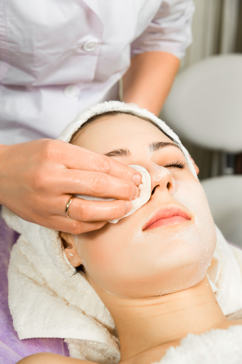 美容师为年轻女性的面部和眼部涂抹保湿医学化学去角质酸面膜