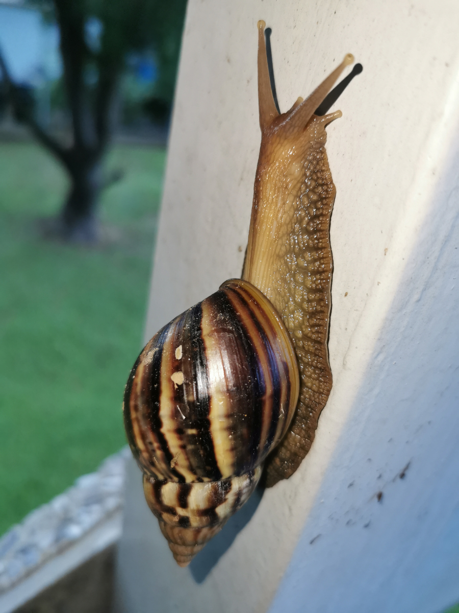 清晨,我在小区院内散步,看到了蜗牛爬树的情形.蜗牛行动非常的缓慢